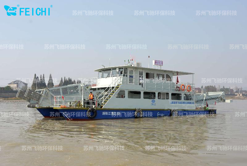 +本船主要用來河道巡查和收集水域各類水面漂浮垃圾(包括綠萍、水葫蘆、樹枝等),又能清掃體積較小的、成片的漂浮垃圾(如白色的污染物、塑料袋、空瓶、樹葉等)。同時能將收集的垃圾自動卸載到指定的裝載船、岸上碼頭、垃圾運輸車等適應設備上,且連續性好。